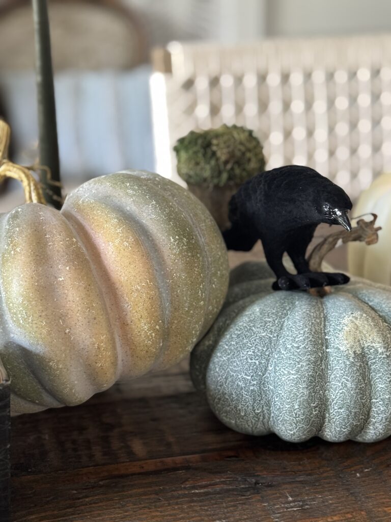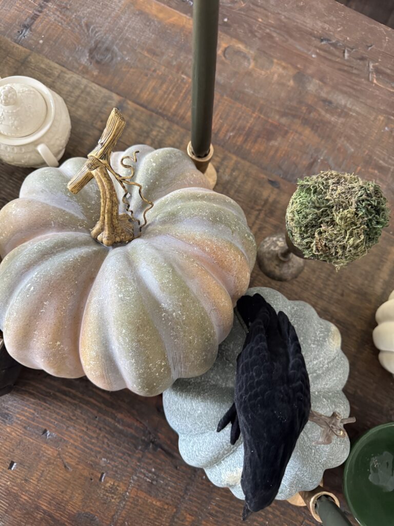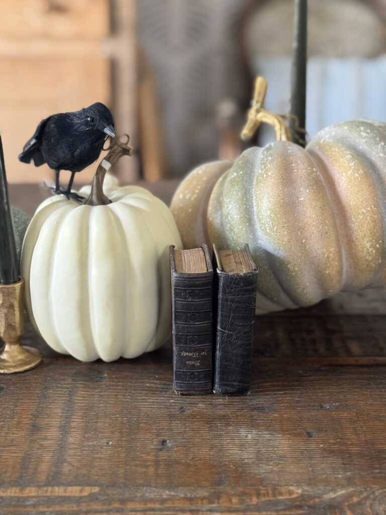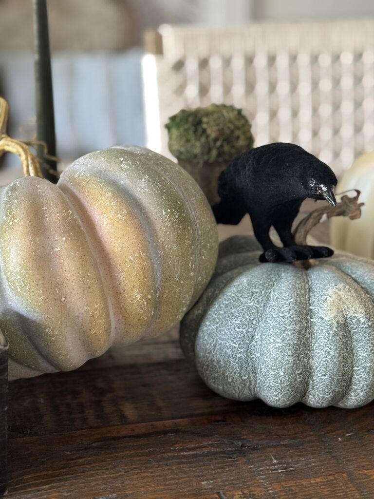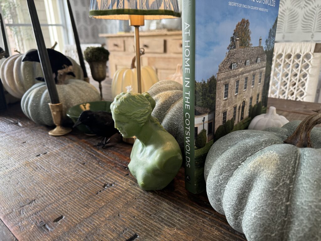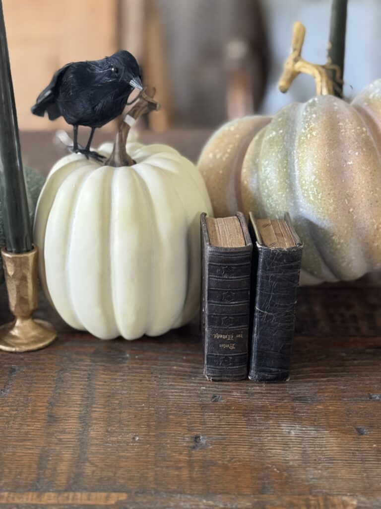 I went with green and cream pumpkins, sage colored candles with brass holders and these great “raven” faux birds. They I added a few books, antiques and my favorite little lamps.