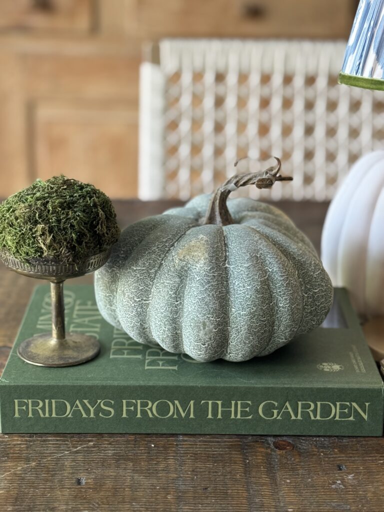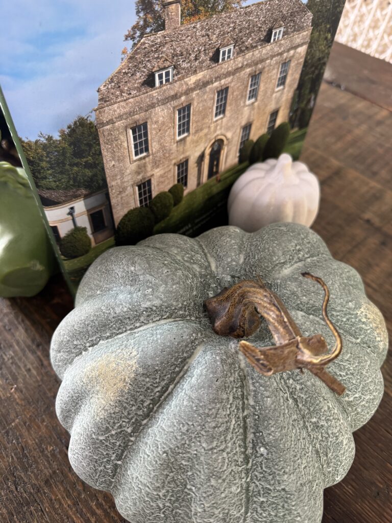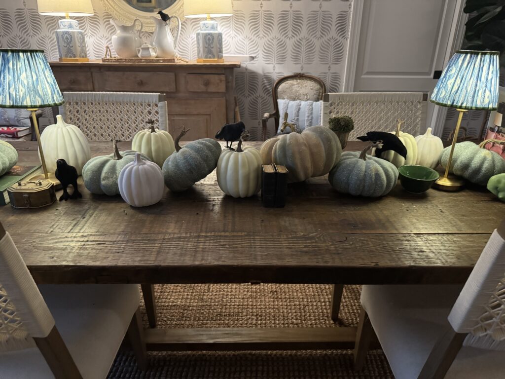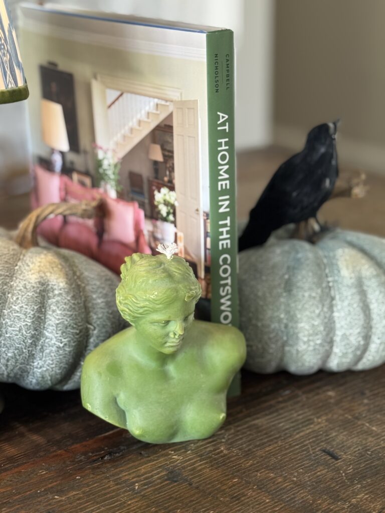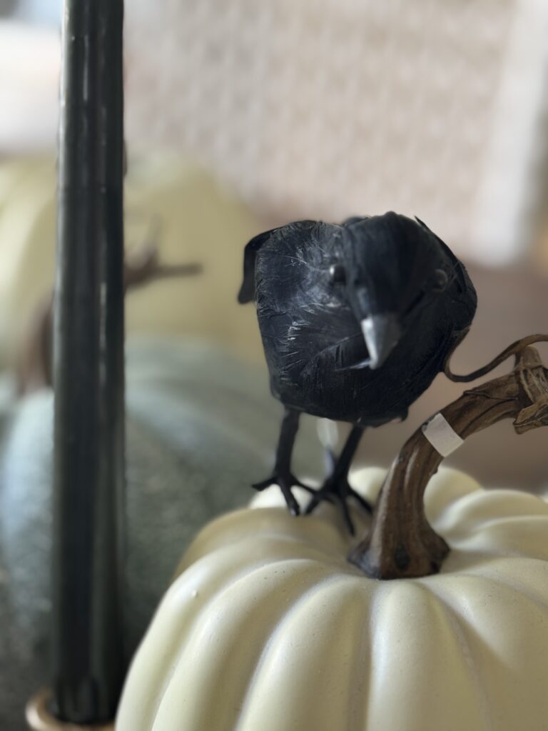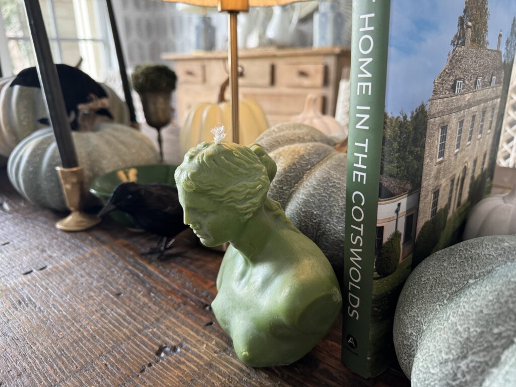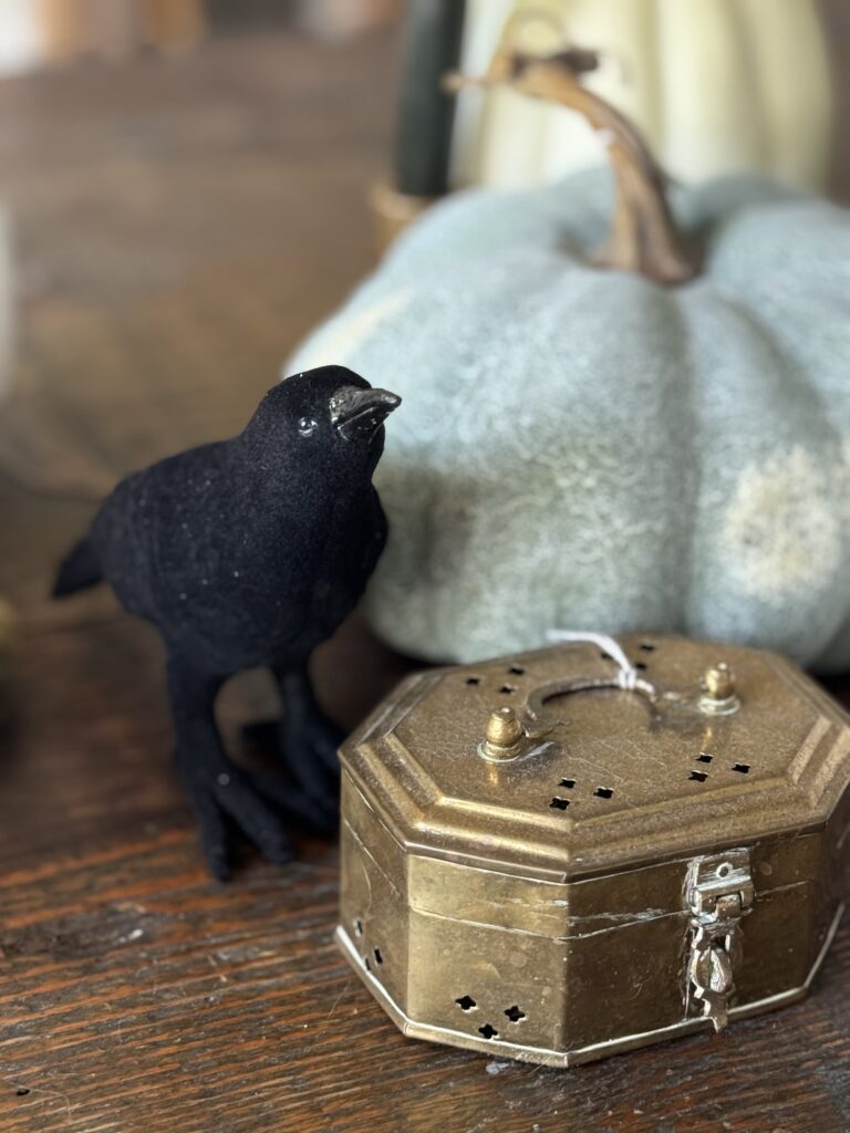 I went with green and cream pumpkins, sage colored candles with brass holders and these great “raven” faux birds. They I added a few books, antiques and my favorite little lamps.