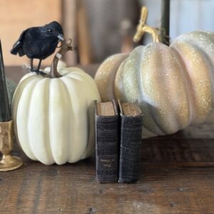 I went with green and cream pumpkins, sage colored candles with brass holders and these great “raven” faux birds. They I added a few books, antiques and my favorite little lamps.